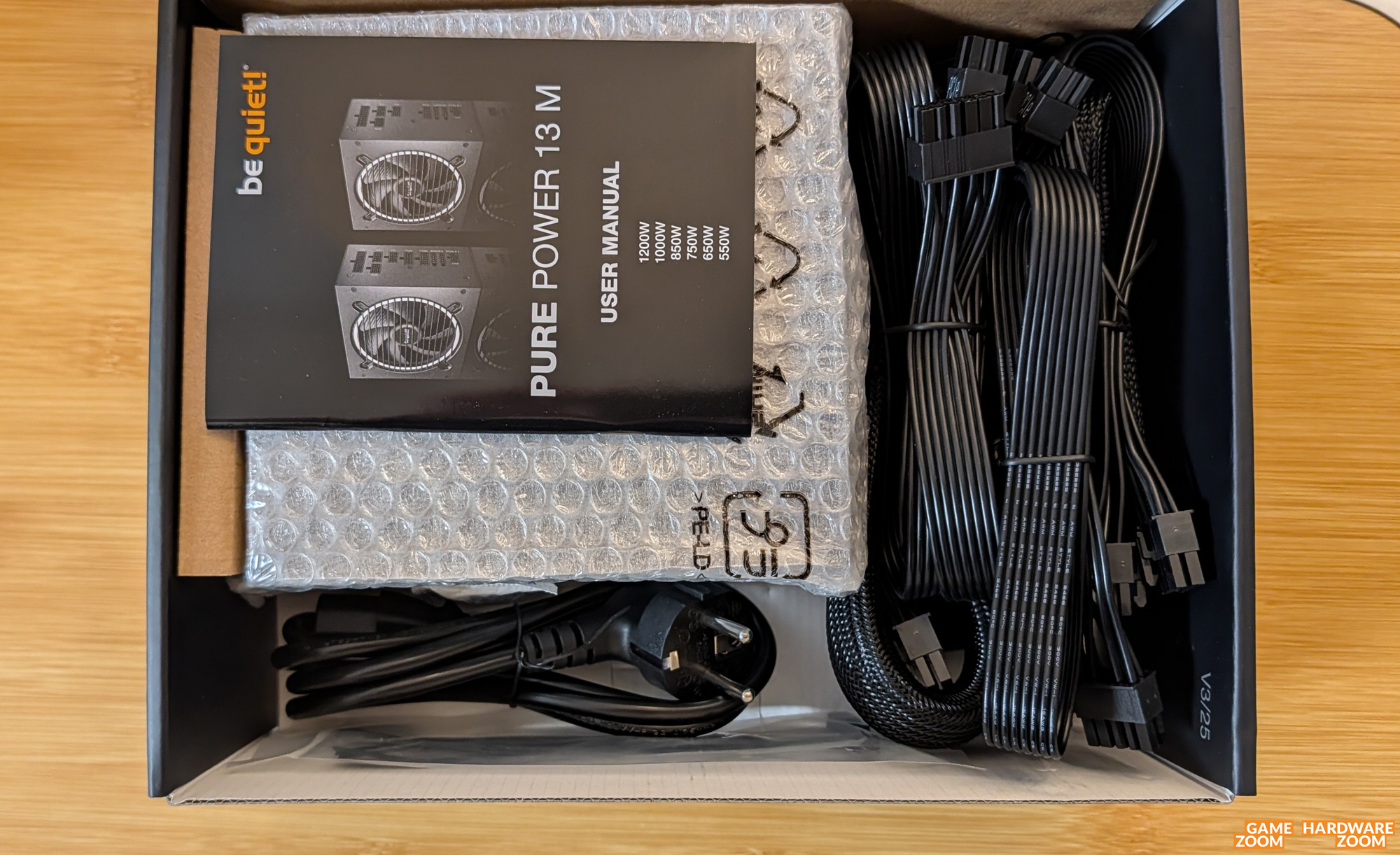 Der Lieferumfang besteht aus: be quiet! Pure Power 13 M 1200W Netzteil, Montageschrauben, Kabel, Kaltstromkabel, Kabelbinder und einer ausführlichen Bedienungsanleitung.