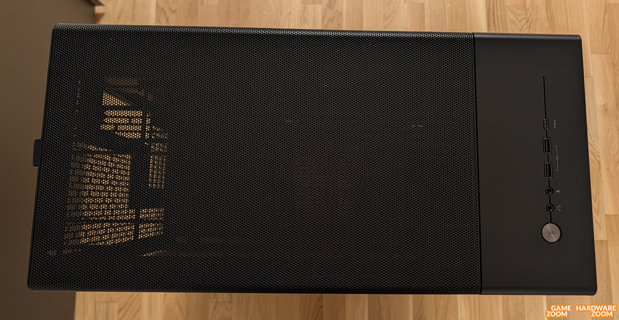 Das I/O-Panel wurde in den vorderen Teil des Deckels integriert. Neben einer Powertaste aus Metall zeigen sich zwei Audiobuchsen, zweimal USB 3.0 und einmal USB-C. Das Meshelement kann an einer Lasche nach hinten gezogen und dann hochgenommen werden. Darunter zeigen sich die optionalen Deckellüfterplätze für drei 120- bzw. zwei 140- oder 180-mm-Lüfter. Alternativ findet maximal ein 360- oder 280-mm-Radiator Platz. Zwischen Blende und Mainboardoberkante gibt es einen großzügigen Abstand von knapp sieben Zentimetern.